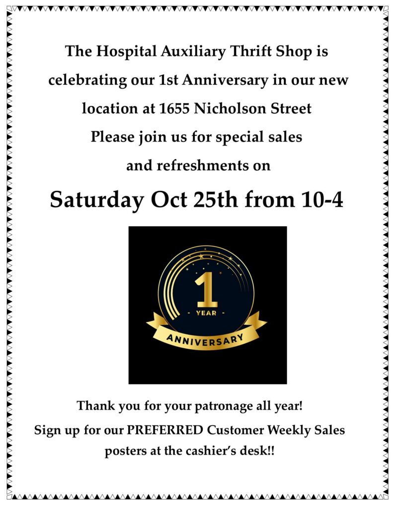 YES….THE AUXILIARY THRIFT SHOP IS CELEBRATING ONE YEAR IN OUR NEW LOCATION